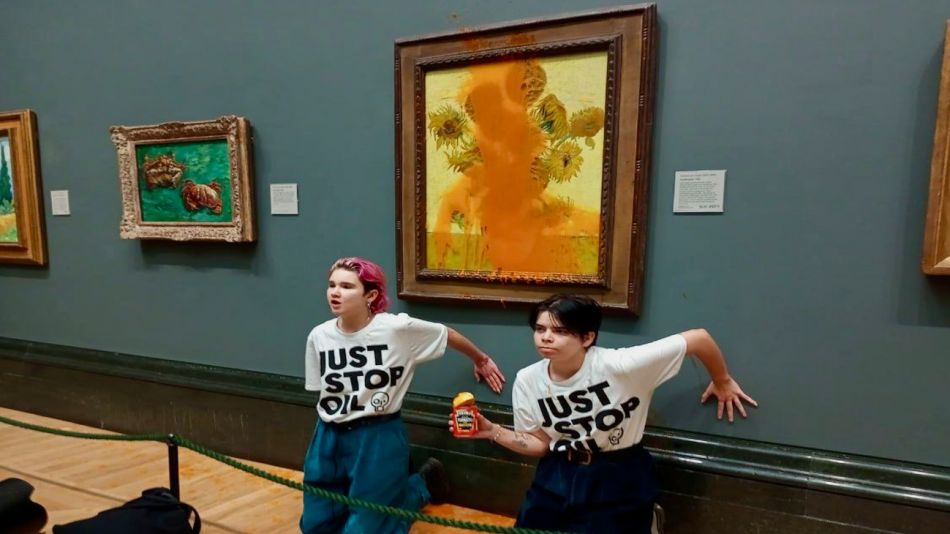 Quedaron detenidos por personal de seguridad del museo. 2 militantes ecologistas arrojaron sopa de tomate sobre el cuadro “Los girasoles”