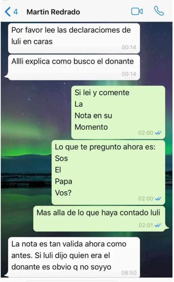 La aclaración llegó vía Whatsapp con Tomás Dente de El Tratamiento, Redrado dijo que el padre de Matilda era quien Luli ya había dicho que era, un estudiante de 26 años y jugador de fútbol americano.