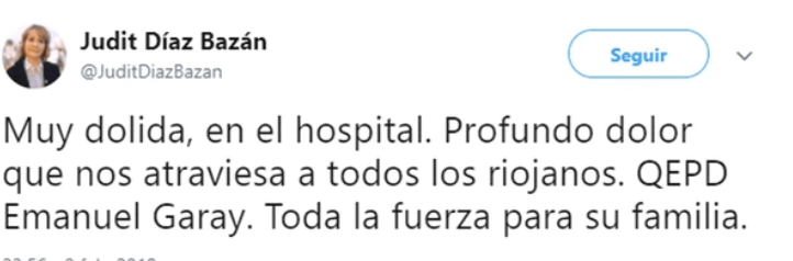 El fallecimiento de Garay fue confirmado por la ministra de Salud provincial, Judit Díaz Bazán, a través de su cuenta de Twitter, y provocó un cambio de carátula en la causa que pasó de “lesiones graves” a “homicidio”.