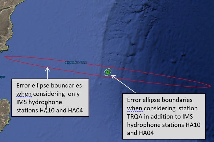 En la imagen, el área comprendida dentro del elipse rojo es el margen de error considerando los hidrófonos en las islas Ascensión y Crozet, a 7000 y 10.000 km de distancia respectivamente. El círculo pequeño es el nuevo radio probable cuando se adicionó la información de dos sensores sísmicos, uno en Tornquist, provincia de Buenos Aires y el otro en Malvinas, concretamente en la isla Gran Malvina. Por el cambio de color del mar en el mapa, se determina que el lugar es la franja donde el océano comienza a ser más profundo.