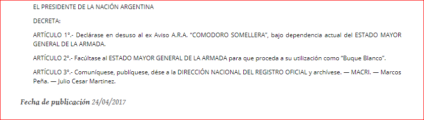 El Decreto 681/2017 publicado el 24 de abril del año pasado daba de baja al ARA Somellera y autorizaba su utilización como “blanco”.